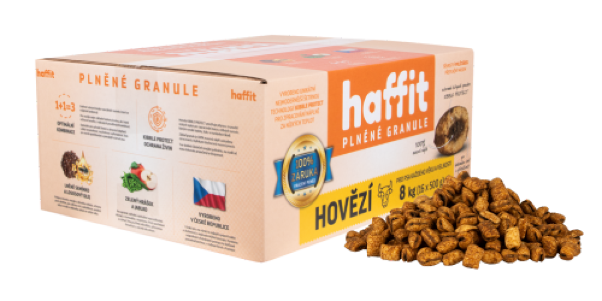 Pro plněné granule HAFFIT je typická chutnost a mimořádně vysoká využitelnost i kompletnost živin. Základem jsou vybrané kvalitní suroviny, převážně živočišné. Unikátní je zpracování technologií KIBBLE PROTECT do třívrstvého polštářku. Hlavní součást granule (66 %) je masová náplň zpracovaná za nižších teplot, aby se horkem nenarušila hodnota a využitelnost živin. Maso je ochráněno dobře propečenou křupavou vrstvou a opatřeno vrchní vrstvičkou s bylinkami. KIBBLE PROTECT – ochrana živin.