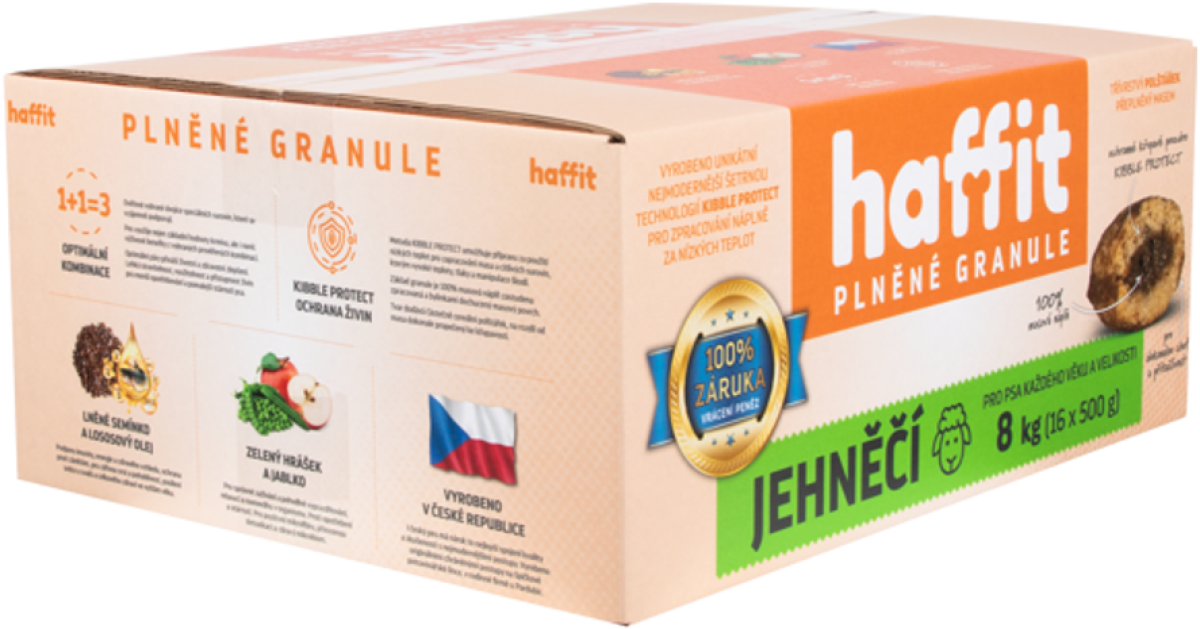Pro plněné granule HAFFIT je typická chutnost a mimořádně vysoká využitelnost i kompletnost živin. Základem jsou vybrané kvalitní suroviny, převážně živočišné. Unikátní je zpracování technologií KIBBLE PROTECT do třívrstvého polštářku. Hlavní součást granule (66 %) je masová náplň zpracovaná za nižších teplot, aby se horkem nenarušila hodnota a využitelnost živin. Maso je ochráněno dobře propečenou křupavou vrstvou a opatřeno vrchní vrstvičkou s bylinkami. KIBBLE PROTECT – ochrana živin.