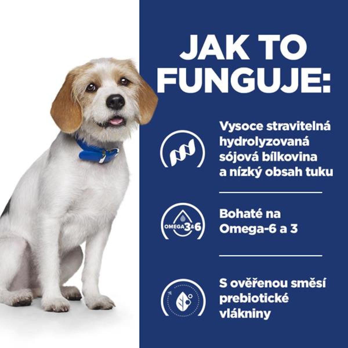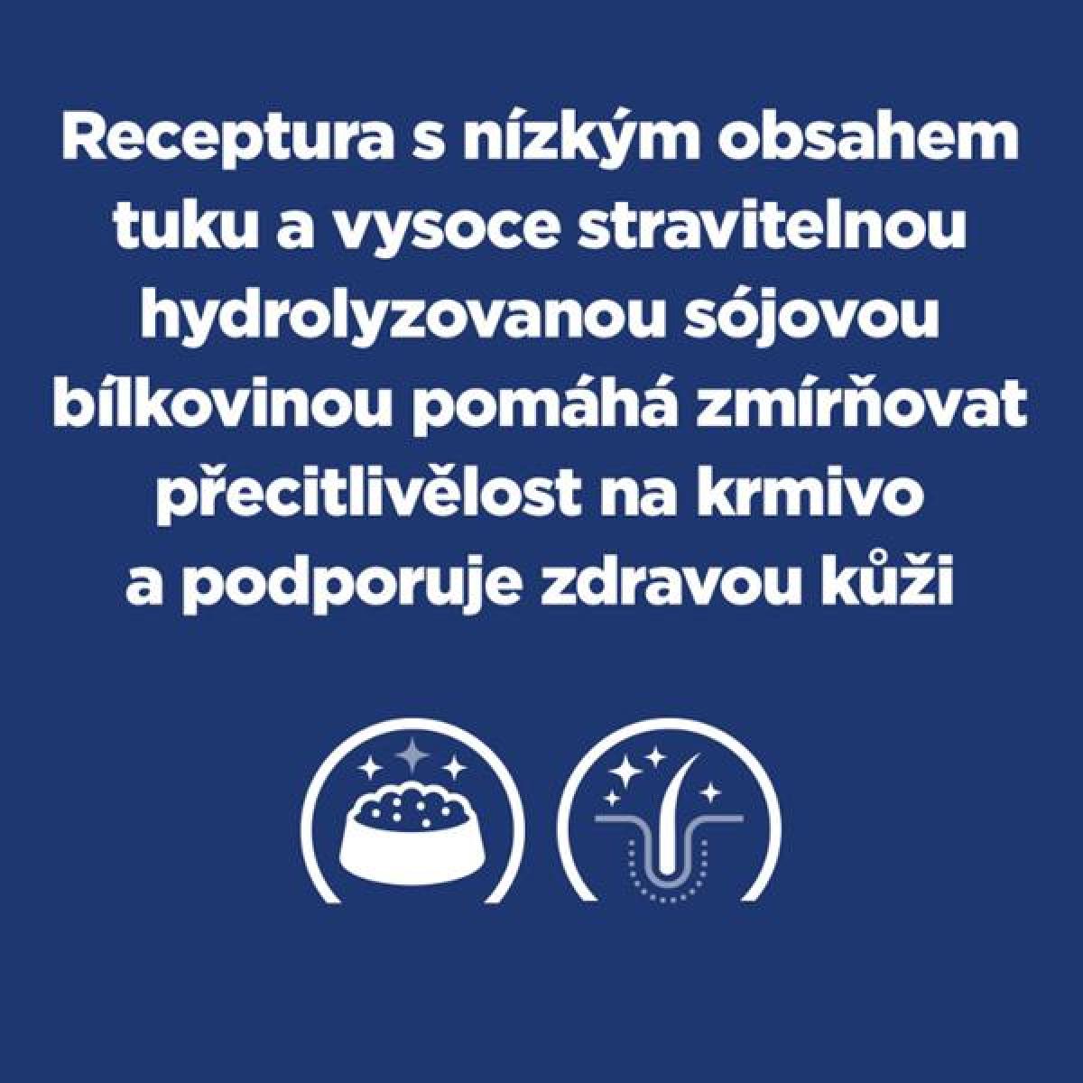 Hill’s Prescription Diet Food Sensitivities z/d Low Fat s hydrolyzovanou sójou je kompletní dietetické krmivo pro dospělé psy určené k omezení nesnášenlivosti vůči určitým ingrediencím a živinám. Krmivo obsahuje vybraný zdroj sacharidů (kukuřičný škrob) a zdroje hydrolyzovaných bílkovin (hydrolyzát sójové bílkoviny, hydrolyzát kuřecích jater). Klinicky ověřená výživa poskytuje viditelnou úlevu při přecitlivělosti na krmivo a alergeny z prostředí a je vhodná i pro pacienty se souběžným onemocněním vyžadujícím snížený obsah tuku.