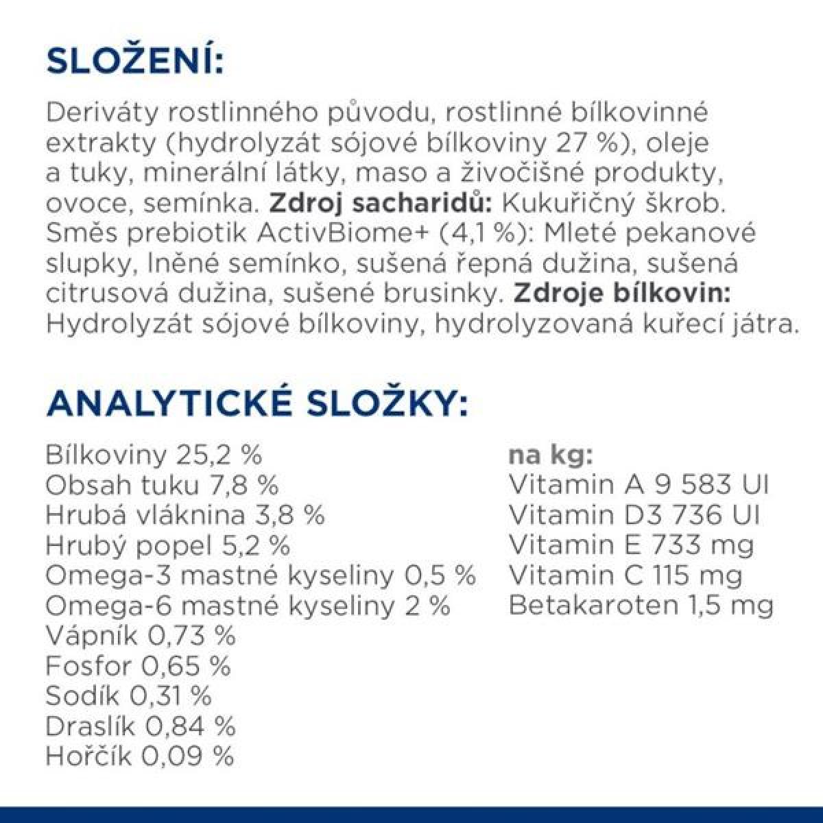 - hydrolyzovaný živočišný protein pomáhá minimalizovat příznaky nežádoucích reakcí na krmivo,
