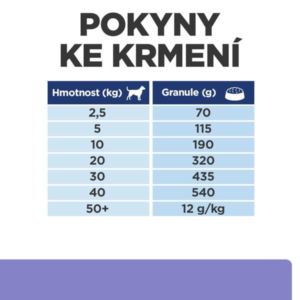Psa krmte výhradně doporučeným krmivem Hill’s Prescription Diet. Výše uvedené doporučené dávkování je pouze orientační. Pokud si nejste jisti, zeptejte se svého veterináře. Přechod na nové krmivo by měl probíhat postupně v průběhu minimálně 7 dní. Zvíře musí mít vždy k dispozici čerstvou pitnou vodu. Nutriční potřeby vašeho mazlíčka se mohou s věkem měnit. Zeptejte se svého veterináře při každé prohlídce.