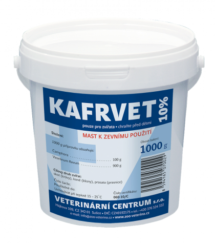 KafrvetKafrová mast způsobuje prokrvení, dráždění kůže a tím snižuje vnímání bolesti. Má rozvněž mírně antiseptické a anestetické vlastnosti. Napomáhá při ošetření akutních zánětů mléčné žlázy u skotu, klisen a prasnic, používá se při edémech vemene, nekrózách kůže, zhmožděninách, odřeninách a otlacích od postrojů a při zánětech kloubů a šlach. Obecně se používá jako derivans. Připravek se vyrábí v koncentracích 10% a 20% a je bez ochranných lhůt. Pro objednání zboží na našem e-shopu klikněnte zde.