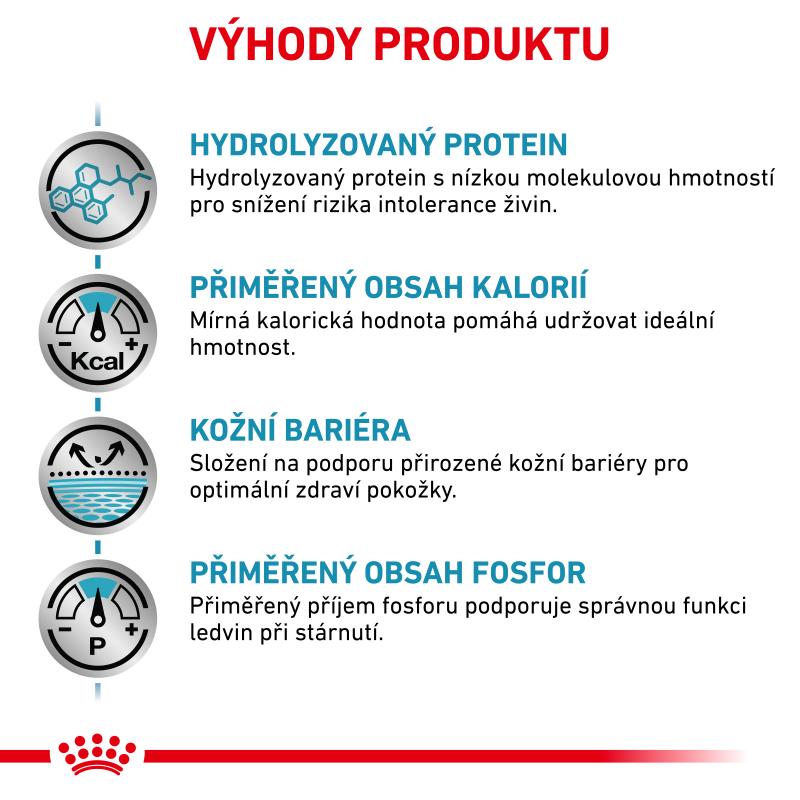 Speciální hypoalergenní veterinární dieta pro dospělé psy se sklony k nadváze trpící potravinovými alergiemi a problémy s trávením. Objeví-li se u psa kožní dermatitida nebo potravní nesnášenlivost, řešte je vyváženou dietní stravou. Hypoalergenní dieta přispívá k léčbě akutních i chronických zdravotních komplikací způsobených nežádoucími reakcemi na potravu a zároveň pomáhá udržet optimální hmotnost u psů se sklony k nadváze.