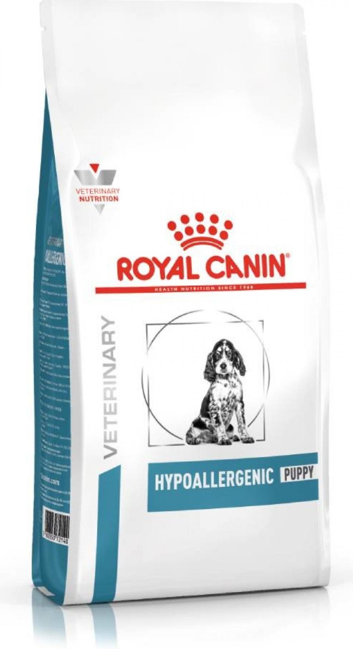 Dietní krmivo pro psy obsahuje vysoce hydrolyzované zdroje bílkovin. Tyto bílkoviny mají velmi nízký alergenní potenciál, a mohou tak snížit riziko nesnášenlivosti. Dále obsahuje rýži, která je zdrojem dobře stravitelných sacharidů. Krmivo Royal Canin Veterinary Canine Hypoallergenic Puppy také poskytuje Vašemu psímu miláčkovi esenciální mastné kyseliny, které podporují přirozenou kožní bariéru.